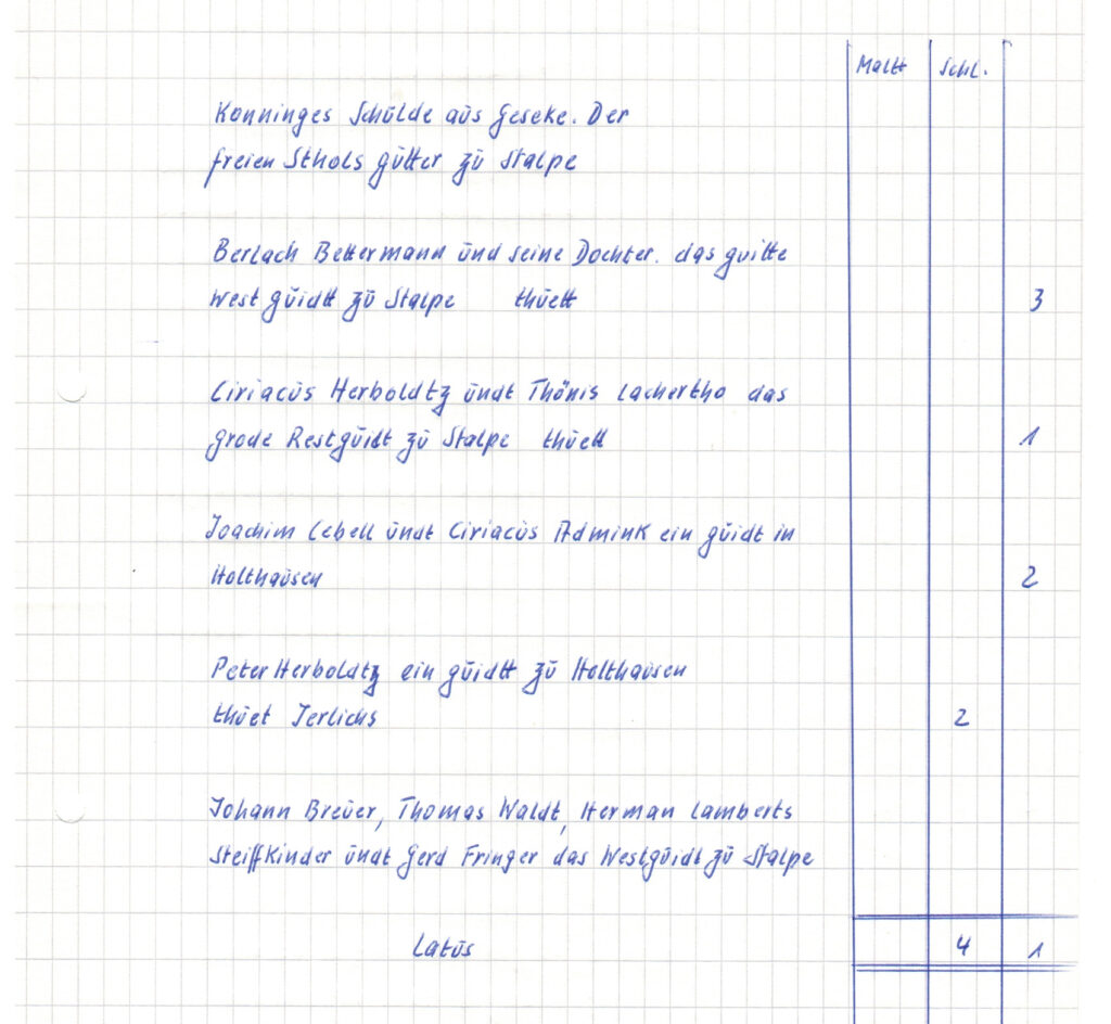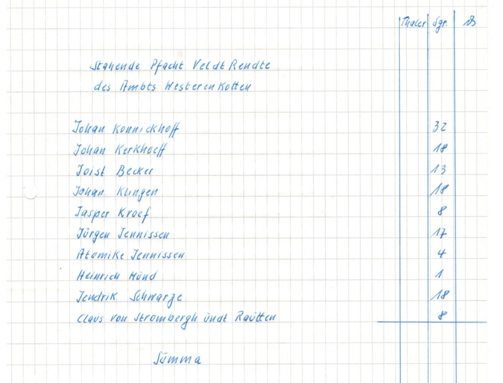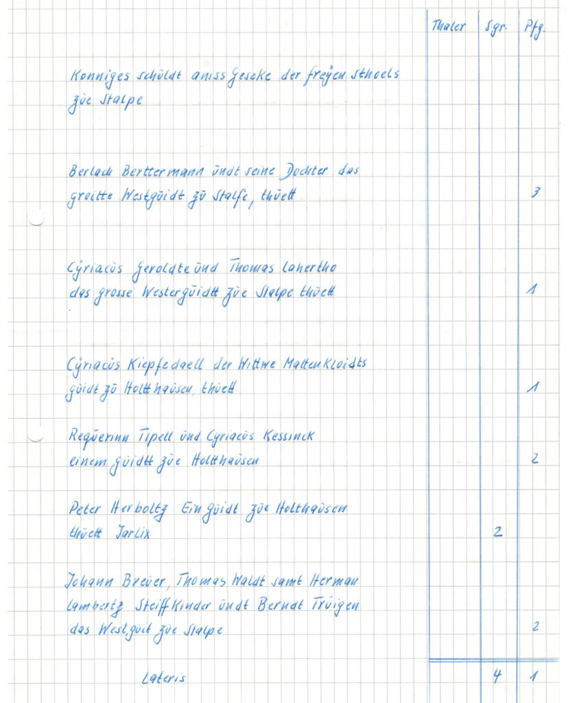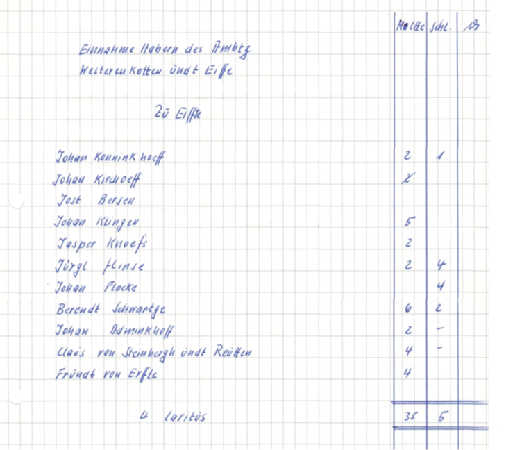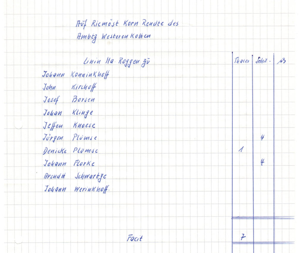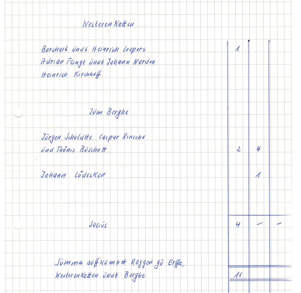[3] Ich habe den Text, vor allem die Familiennamen, in unsere heutige Schreibweise übertragen, so dass das Auffinden leichter ist. Auf die Zwischenaddition der einzelnen Seiten und das Überprüfen der Gesamtzahlen habe ich verzichtet. Die Original-Abschrift kann bei Bedarf bei mir eingesehen werden.