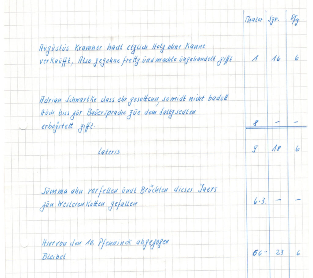 | Augustus Kramer hat etliches Holz ohne Kanne verkauft, aber zugegeben freiwillig und machte umgewandelt… | |||
