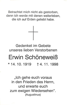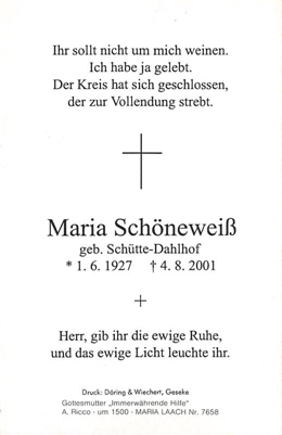 Beim Ordnen meiner Akten fand ich auch noch einen Bestand mit Abschriften von Erwin Schöneweiß, die er im Vorfeld der Erstellung des Heimatbuches „Bad Westernkotten – Altes Sälzerdorf am Hellweg“, Lippstadt 1987, erstellt hatte.[1] Herr Schönweiß wohnte damals mit seiner Frau Maria bei Emmy und Ferdinand Mönnig als Mieter in der Weringhauser Straße neben der ehemaligen Weringer Mühle. Hier die Totenzettel des Ehepaares Schöneweiß: