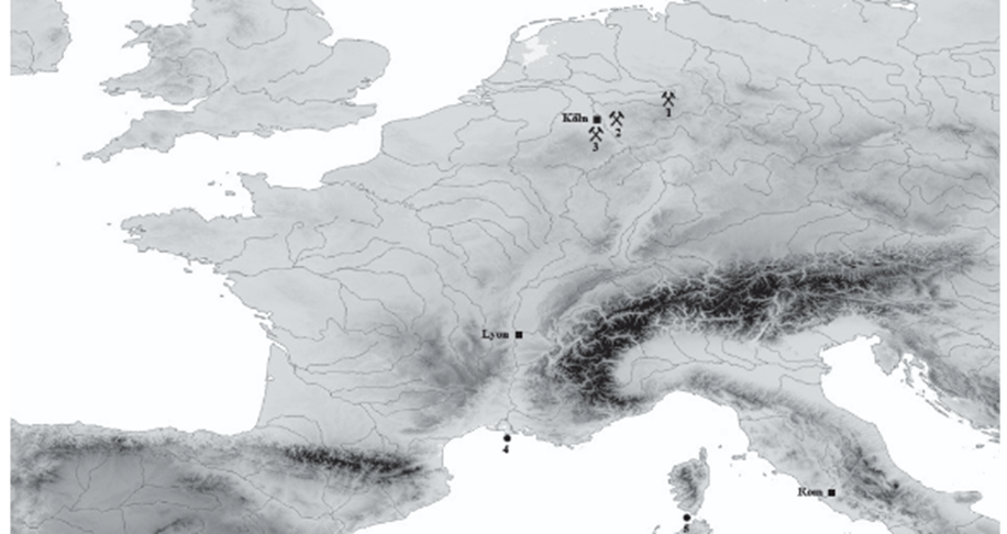 Abb. 12: Bergbauregionen im römischen Germanien und Fundorte von Schiffswracks mit Plumbum Germanicum-Barren. (1) Briloner Hochfläche/Sauerland (2) Bergisches Land (Lüderich, Engelskirchen-Bliesenbach) und Siebengebirge (Königswinter-Bennerscheid/Hennef-Altglück) (3) Nordeifel (Mechernich-Kall-Keldenich; Stolberg) (4) St.-Maries-de-la-Mer (5) Rena Maiore.