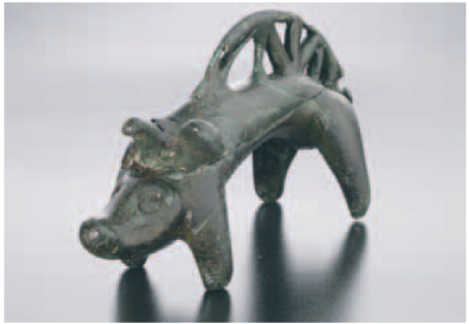 „Wie aufregend Archäologie sein kann, beweist die kleine, beschädigte Eberstatue aus Bronze, die im Jahre 2002 Fritz Dietz im Raum Erwitte (Kreis Soest) gefunden hatte (siehe Neujahrs-Gruß 2003, S. 123[7]). Die fehlende Rückenpartie hat zahlreiche Diskussionen über das Gesamtbild des Tierfigürchens ausgelöst, die dann zu einem ersten Rekonstruktionsversuch führten. Dass Vergleiche von Fundmaterial aufgrund von stilistischen Kriterien nicht immer zutreffend sein müssen, zeigt der neue Fund von Fritz Dietz (siehe Abbildung). Etwa 5 m von der Fundstelle der Eberstatue entfernt entdeckte er nämlich das fehlende Rückenteil mit dem vollständig erhaltenen Kamm, der wider Erwarten nicht massiv, sondern durchbrochen gestaltet ist. Eine erste Überprüfung des Fundes, der noch bis Februar 2006 in der Landesaustellung im Museum in Herne zu besichtigen ist, deutet nach Aussage unserer Restauratorin auf einige technische Überraschungen hin (R. Tegethoff).“