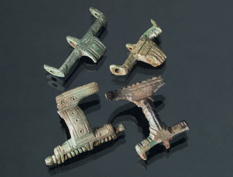 Abb. 1: Massive Stützarmfibeln mit Trapezfuß (links) und Varianten (rechts) aus dem Raum Erwitte. Das Exemplar oben links wurde in zwei Teile zerbrochen an verschiedenen Stellen gefunden; wieder zusammengesetzt besitzt es eine Länge von 5,2 cm und ein Gewicht von 32 g (Foto: LWL-Archäologie für Westfalen/S. Brentführer)