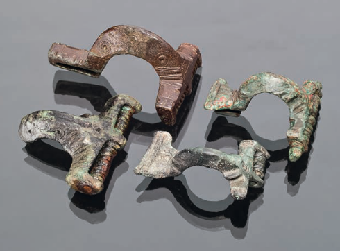 Abb. 2: Stützarmfibeln mit bandförmigem Bügel und Zwischenform (rechts unten) aus dem Raum Erwitte. Die kreisaugenverzierte Fibel (links unten) ist 3,2 cm lang und besitzt einen 4 cm breiten Stütz-Arm, Gewicht 15 g (Foto: LWL-Archäologie für Westfalen/S. Brentführer)