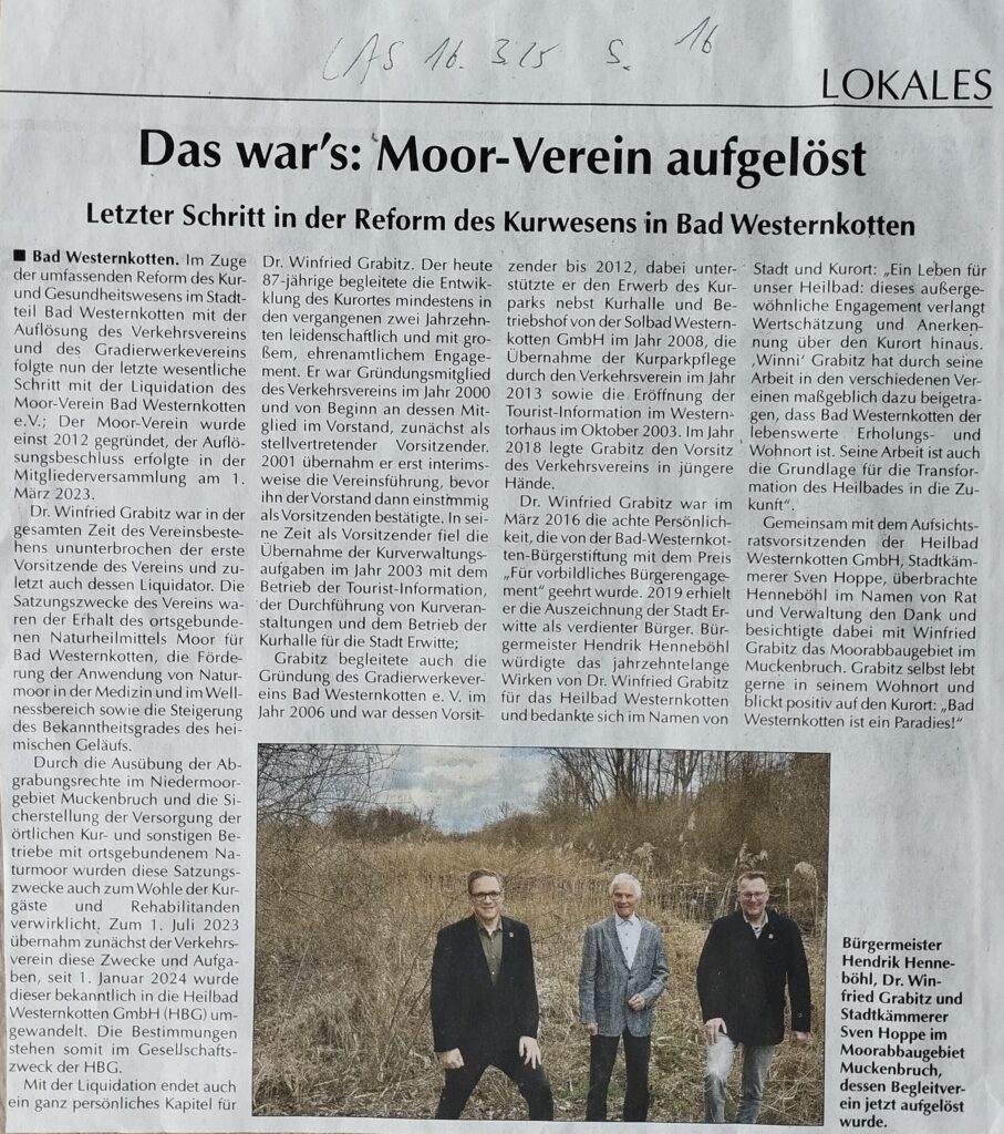 Von der Aufösung berichtet die Chronik 2023 wie folgt: „Die drei Vereine Moorverein, Gradierwerkeverein und Verkehrsverein haben 2023 ihre Existenz eingestellt bzw. wurden in die Heilbad GmbH und den Salinenverein – gegründet 2023 – überführt.