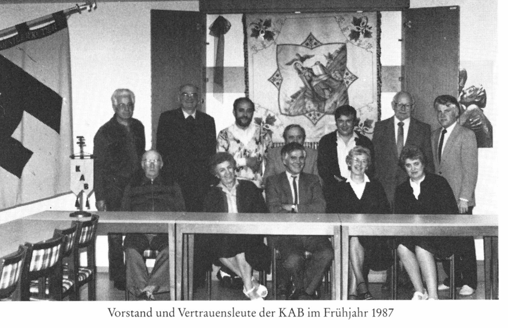 Einen ersten Eindruck über „unsere“ KAB vermittelt der entsprechende Text im Heimatbuch von 1987: „1985 entdeckte der Vereinspräses der KAB, Pfarrer Norbert Gersmann, im Pfarrhaus die fast lückenlose Vereinschronik der KAB von 1905 -1933. Zu den Fundstücken gehörte auch die im Jahre 1908 angeschaffte Vereinsfahne. Dieses Prunkstück wurde inzwischen von Franz Pütter in mühevoller Arbeit restauriert und ist seit dieser Wiederentdeckung im Pfarrzentrum ausgestellt. Nach der Vereinschronik wurde der katholische Arbeiterverein am 26.11.1905 unter Vorsitz des damaligen Pfarrers und Präses Franz Bokel im Gasthof Wiese gegründet. Zunächst wurde ein provisorischer Vorstand gebildet, und zwar aus den Mitgliedern Franz Dietz, Josef Brexel, Franz Hense, Anton Jütte, Heinrich Ferdinands und Wilhelm Linnemann. Aus den gut erhaltenen Protokollniederschriften ist zu ersehen, daß schon damals monatlich Versammlungen stattfanden, in denen zeitgemäße Themen behandelt wurden. Am 28. Januar 1906 genehmigte die Generalversammlung die vom Vorsitzenden Pfarrer Bokel vorgelesenen Statuten des Vereins. Der provisorische Vorstand wurde wiedergewählt. Aus der Vereinschronik ist weiter zu entnehmen, daß die Familie im Mittelpunkt des Vereinslebens stand. So fand schon damals alljährlich ein Familienausflug statt. Gute Kontakte bestanden zu den Nachbarvereinen Geseke und Anröchte. Kurz nach der Gründung zählte der Verein 104 Mitglieder. Die im Jahre 1908 angeschaffte Vereinsfahne wurde in Handarbeit im Mutterhaus der Franziskannerinnen in Salzkotten angefertigt. Die Herstellungskosten beliefen sich auf 350,— Mark, für damalige Verhältnisse eine beachtliche Summe. Die Vereinsfahne wurde bei allen kirchlichen Anlässen getragen. Die in sauberer Sütterlinschrift geschriebenen Protokolle lassen erkennen, daß sich der Verein in vielen Jahrzehnten kulturell und besonders in sozialer Hinsicht stark engagiert hat. So existierte ein Unterstützungsfond für in Not geratene Mitglieder. Es bestanden auch Theater-, Gesangs- und Turngruppen. So fand am 17. August 1913 ein großes Sportfest — Bezirksfest — der Dekanate Rüthen-Geseke-Büren statt. Auf dem Schützenplatz wurde in zwei Abteilungen ein Wetturnen veranstaltet. Nachmittags wurde von 31 teilnehmenden Vereinen ein großes turnerisches Programm vorgeführt. Durch den Nationalsozialismus wurde ab 1933 die Arbeit der KAB sehr erschwert. Aus einem Rundschreiben des Bezirksverbandes der KAB aus dem Jahre 1933 geht hervor, daß man bemüht war, die Vereinsarbeit weiterzuführen. Es wurde empfohlen, in den Vereinen Ruhe zu bewahren und zunächst auf Versammlungen zu verzichten. Die letzten Aufzeichnungen datieren aus dem Jahre 1934. Das Jahr 1934 war auch das vorläufige Ende der KAB.