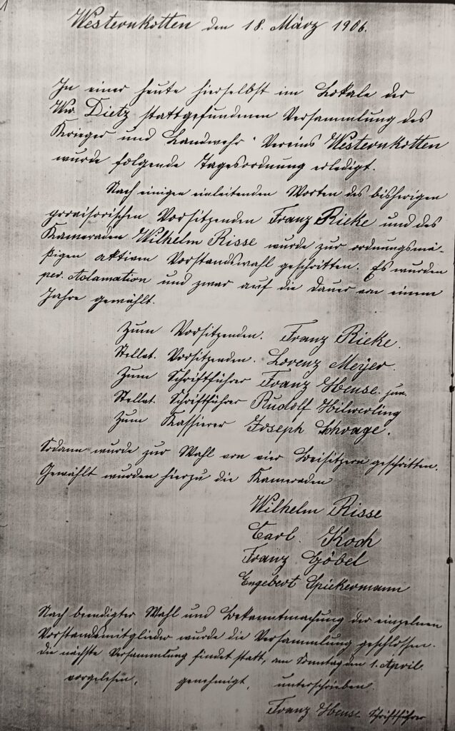 Den ersten Vorstand bildeten: Landwirt Franz Rieke (Vors.), Schuhmacher Lorenz